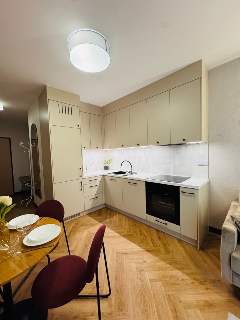 Apartament Kusocińskiego o powierzchni 40m² składa się z sypialni, salonu z w pełni wyposażonym aneksem kuchennym, łazienki z WC z prysznicem i pralką. W apartamencie dostępna jest również sieć wi-fi.