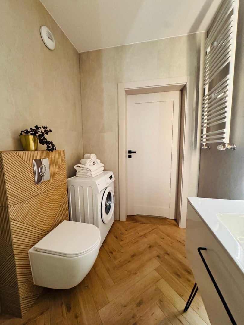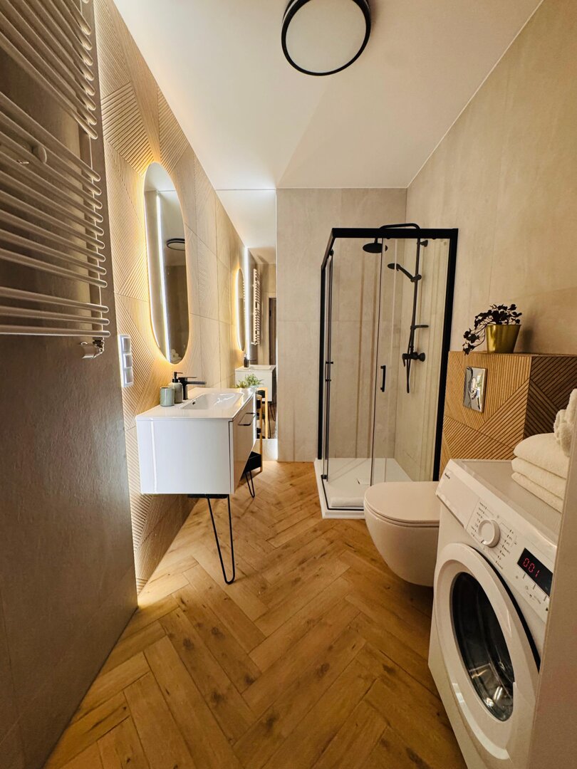 Nowoczesny apartament w centrum Radomia dla maks. 6 dorosłych osób. 2 sypialnie, salon z aneksem kuchennym, balkon, parking w garażu podziemnym, szybkie Wi-Fi i wygodny self check-in.