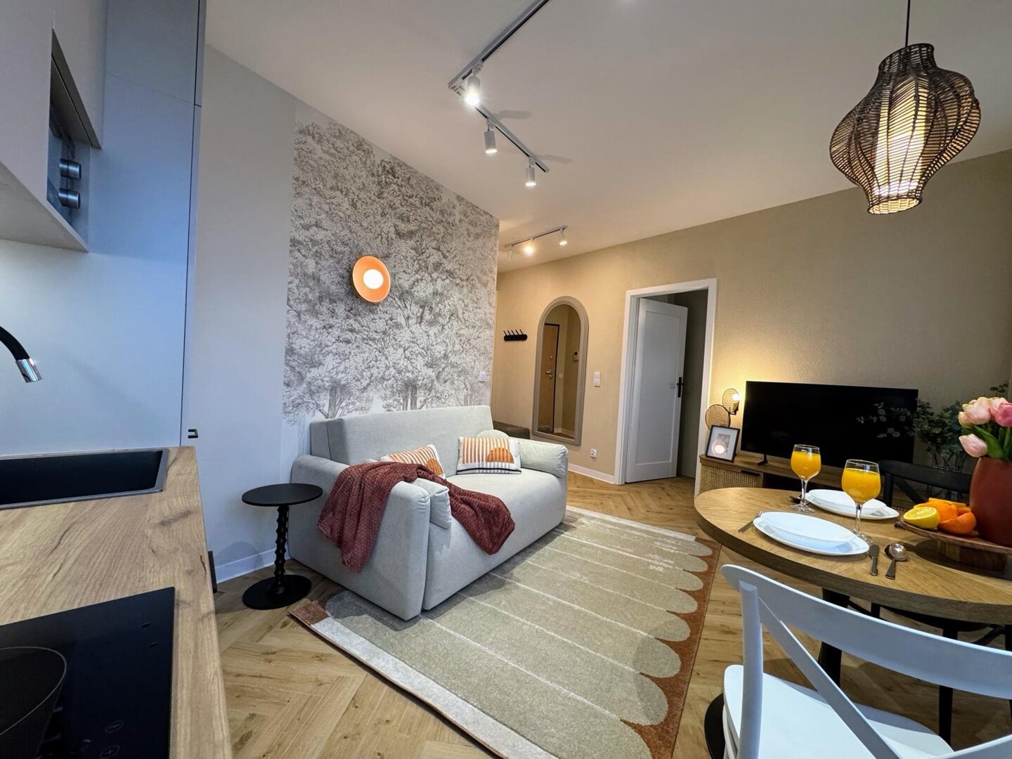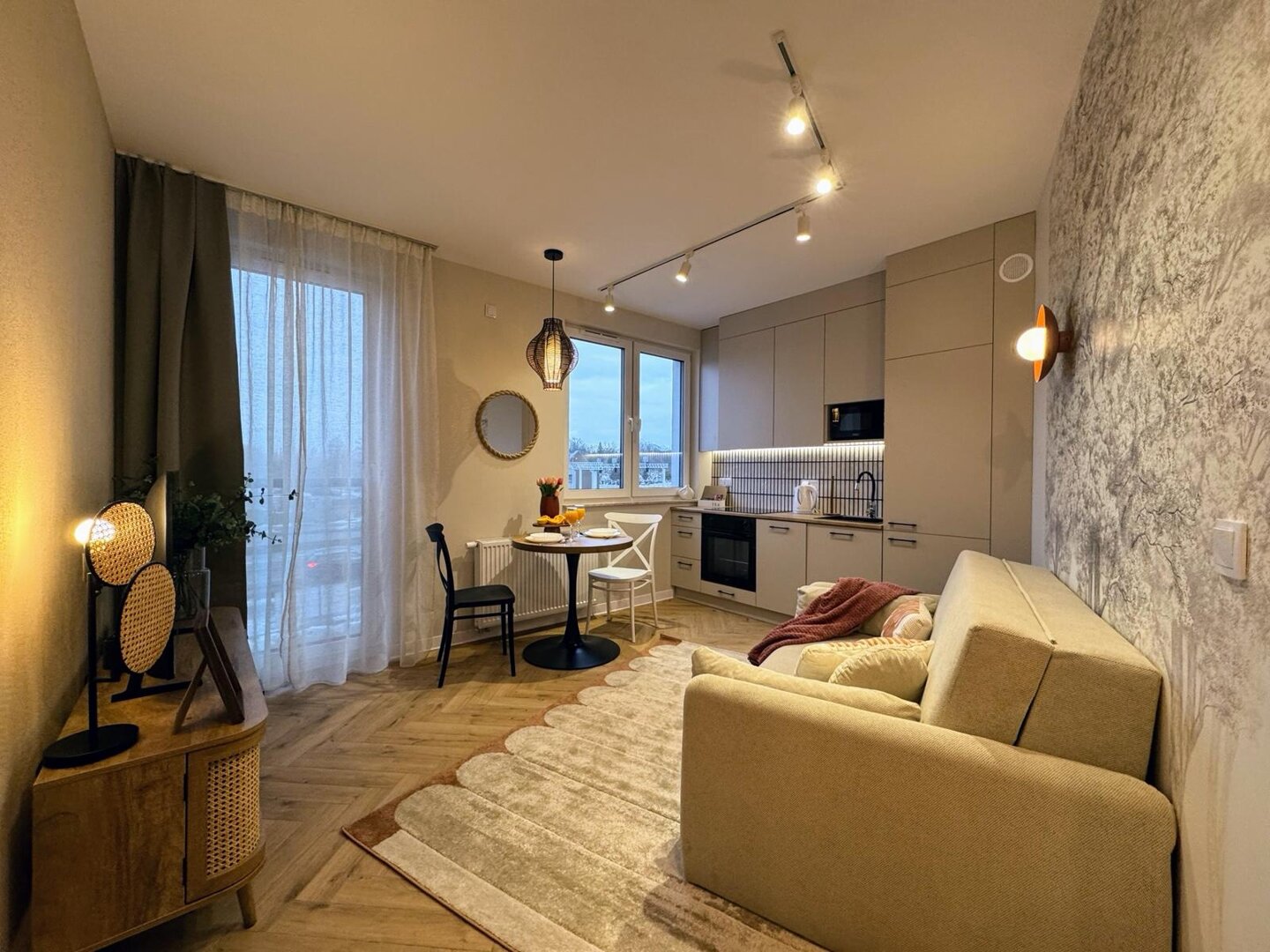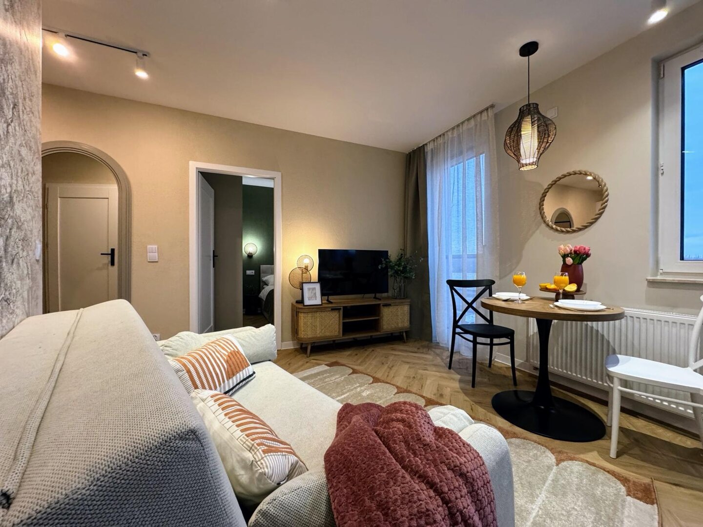 Stylowy apartament w centrum Radomia dla maksymalnie 4 osób. 1 sypialnia, salon z rozkładaną sofą, balkon, parking w garażu podziemnym i wygodny self check-in.