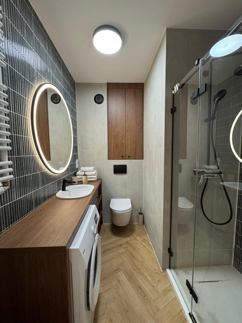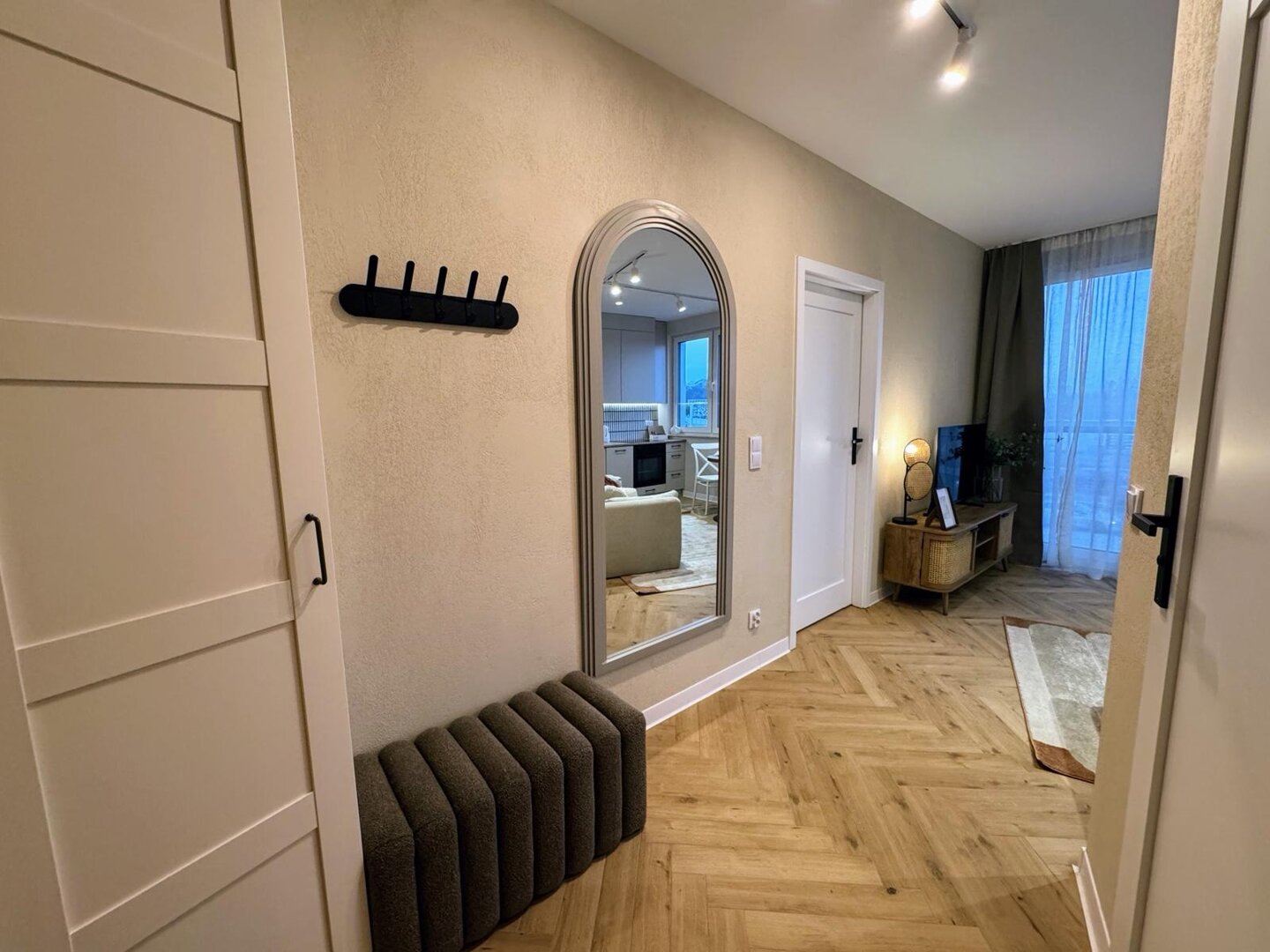 Nowoczesny apartament w centrum Radomia dla maks. 6 dorosłych osób. 2 sypialnie, salon z aneksem kuchennym, balkon, parking w garażu podziemnym, szybkie Wi-Fi i wygodny self check-in.