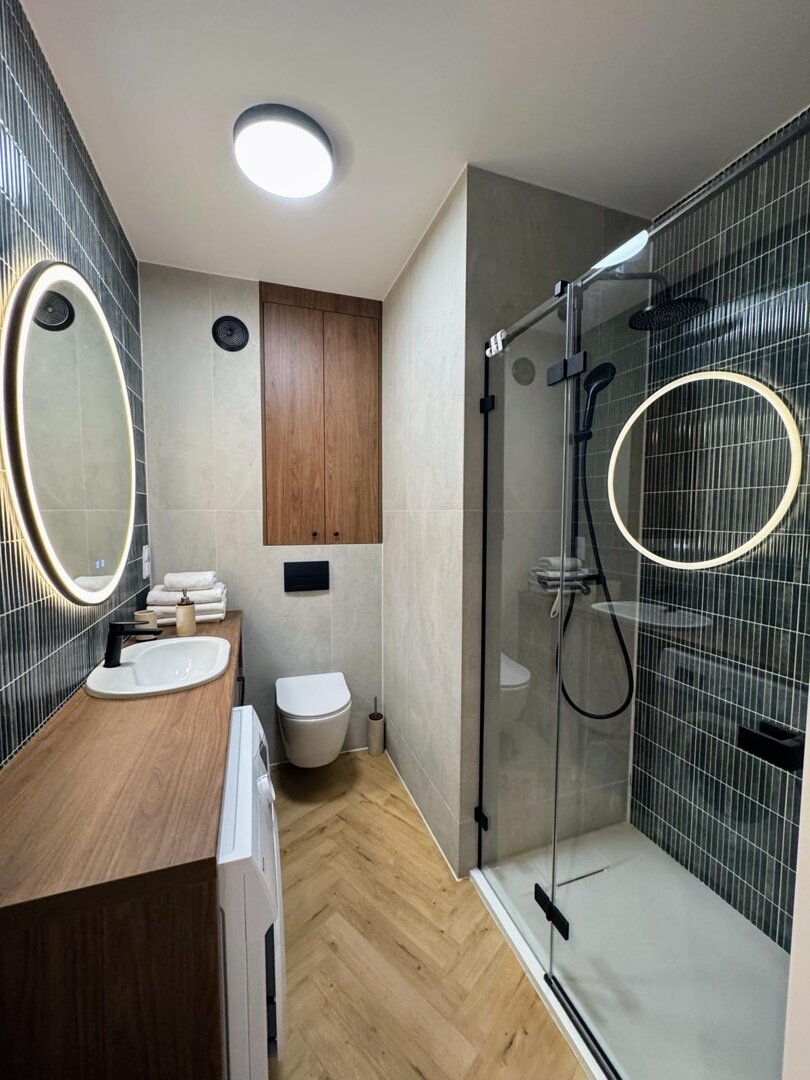 Łącza wi-fi, Smart TV, lodówki, piekarnika, płyty indukcyjnej, zmywarki do naczyń, pralki, żelazka, suszarki do włosów i w pełni wyposażonej kuchni. Budynek posiada windę.